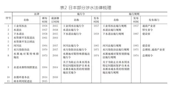 日本的法律體系可以分為憲法、法律、政令、省令和通達(dá)5個層次。通過國會頒布法律、內(nèi)閣頒布政令以及省頒布省令,對涉水工作進(jìn)行全面的規(guī)定(見表2)。例如國會頒布《河川法》,內(nèi)閣負(fù)責(zé)發(fā)布《河川法施行令》,主管河道的國土交通省負(fù)責(zé)發(fā)布《河川法施行規(guī)則》。整個法律體系層次清晰、責(zé)任明確、詳略互補(bǔ),全方位指導(dǎo)涉水工作的開展。日本城市水系統(tǒng)相關(guān)法律較為豐富,核心的涉水法律有《河川法》《水資源開發(fā)促進(jìn)法》《水道法》《下水道法》《水污染防治法》等10余部,覆蓋了河流水系、水資源、供水、用水、排水、水環(huán)境和健康水循環(huán)理念等水系統(tǒng)多角度、全要素的內(nèi)容。日本涉水法律內(nèi)容詳盡,明確涉水工作的責(zé)任主體、職能分工、協(xié)調(diào)機(jī)制,部分法律還對技術(shù)標(biāo)準(zhǔn)進(jìn)行詳細(xì)規(guī)定,例如《水道法》將水質(zhì)基準(zhǔn)的內(nèi)容納入法律框架體系,強(qiáng)化了標(biāo)準(zhǔn)執(zhí)行力度。日本涉水法律體系修訂更新周期短,如有必要最短1年時間即可開展法律修訂,例如《下水道法》在2005年、2011年和2015年分別針對城市內(nèi)澇、事權(quán)改革、雨水公共下水道建設(shè)問題開展修訂,極大的保障了法律的適應(yīng)性。