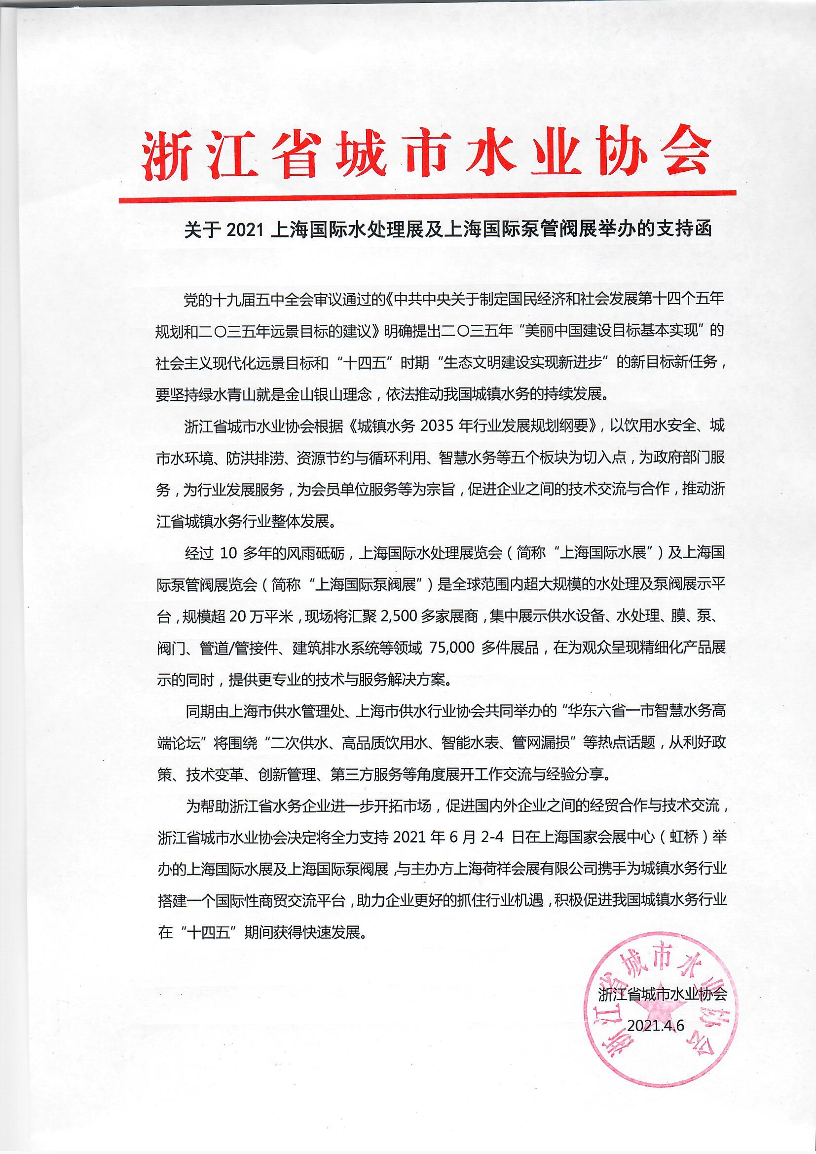 為幫助浙江省水務(wù)企業(yè)進(jìn)一步開(kāi)拓市場(chǎng),促進(jìn)國(guó)內(nèi)外企業(yè)之間的經(jīng)貿(mào)合作與技術(shù)交流,浙江省城市水業(yè)協(xié)會(huì)決定將全力支持 2021 年 6 月 2-4 日在上海國(guó)家會(huì)展中心(虹橋)舉辦的上海國(guó)際水展及上海國(guó)際泵閥展,與主辦方上海荷瑞展覽有限公司攜手為城鎮(zhèn)水務(wù)行業(yè)搭建一個(gè)國(guó)際性商貿(mào)交流平臺(tái),助力企業(yè)更好的抓住行業(yè)機(jī)遇,積極促進(jìn)我國(guó)城鎮(zhèn)水務(wù)行業(yè)在"十四五"期間獲得快速發(fā)展。