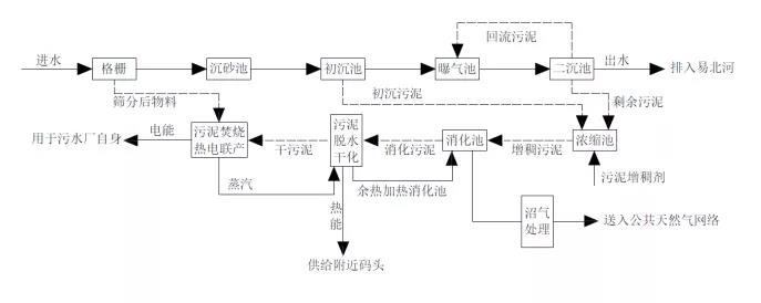 德國k?hlbrandh?ft/dradenau 污水處理廠位于德國漢堡,應屬德國最大的污水處理廠,負責處理周邊200萬居民生活污水以及歐洲第三大海港工業廢水。處理水量達38.2×104m3/d(規模約為240萬當量人口,pe);進水水質為:cod=850 mg/l,tn=67 mg/l,tp=9.4 mg/l。該廠由漢堡水務公司經營,改造前是該市最大公共能源消耗單位之一。該廠主流處理工藝為活性污泥法,生化段出水投加化學藥劑除磷。污泥處理包括剩余污泥厭氧消化產沼氣、沼氣熱電聯產、消化后污泥繼續干化、焚燒用于能量回收。該廠污水、污泥處理全工藝流程如圖2所示。