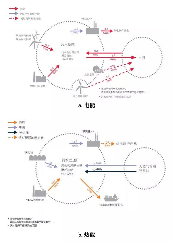 k?hlbrandh?ft/dradenau污水處理廠對剩余污泥進行厭氧消化,同時收集廠外生物廢棄物與污泥共消化以增加沼氣產量,并實現沼氣轉換為天然氣對外輸送。后續消化熟污泥施以焚燒處置,進一步熱電聯產回收電能和熱能;電能彌補自身電耗使用,熱能則被輸送至污泥干化設備,可完全滿足高溫干化需要;污泥干化后的低溫余熱可繼續供消化池保溫使用。如此設計,可實現電能與熱能高效回收利用。此外,自2009年起該廠富余熱能還向附近碼頭輸出供應。圖3為該廠2018年電能與熱能流向示意圖。該廠污泥焚燒產能遠遠大于沼氣熱電聯產,且應用太陽能、風能等清潔能源,實現能源回收的同時進一步減少co2排放。2018年該廠總電耗為107.2 gw·h/a,產電量為115 gw·h/a,電能自給率達107%;總熱耗為99.7 gw·h/a,產熱量為113 gw·h/a,熱能自給率達113%??梢?,該廠通過自身進水中高濃度有機物(cod=850 mg/l)、外源有機廢棄物、太陽能、風能等綜合利用,已超越能源中和目標并可向外供氣(ch4)和熱。預計未來該廠將達到發電量大于耗電量的30%,熱能供應范圍也將進一步擴大。