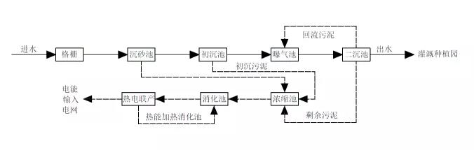 ①沼氣熱電聯產(chp)。該廠配備有4個污泥厭氧消化池,總池容6 200 m3。厭氧消化溫度控制為35 ℃,沼氣中ch4含量65%~68%。chp產生電能和熱能,其中,熱能用于加熱消化池,電能則輸入公共電網。