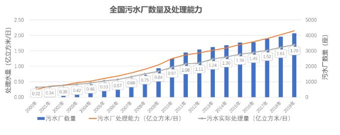 污水處理量:截至2019年底,全國城市和縣城污水處理廠共4140座,污水實際處理總量達到1.7億m3/d,污泥產量約6000萬噸/年(80%含水率)。