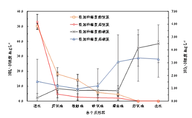 與此同時,纖維素投加對磷去除的影響與cod類似,在纖維素投加初期(第36~50 天),出水總磷(tp)和正磷酸鹽(po3-4-p)濃度均開始惡化,去除率分別降低至51.99%和56.32%。從發生原因來看,do不足是導致磷去除效率下降的主因,可以從增大曝氣量后出水tp逐漸下降得到驗證。然而,出水tp含量在提高曝氣量后的很長一段時間內也沒有恢復至投加纖維素前水平,而是保持在(2.86±1.22) mg/l左右。為進一步分析其原因,在第68 天從曝氣池末端取混合樣進行了聚磷菌(paos)活性測定,并與投加纖維素前的活性進行了對比。結果顯示,投加纖維素后,反應器中paos比釋磷速率和比吸磷速率分別為11.3 和12.0mg/(gvss?h),與投加前的10.8 、13.4 mg/(gvss?h)相比變化并不是很大。可見,纖維素的投加對paos活性的影響并不大。因此,反應器除磷效果恢復較慢的原因可能與纖維素投加初期導致的跑泥和生物量恢復較慢有關。2.2 纖維素對氮去除的影響圖3顯示了在投加纖維素前后裝置對氮去除效果的變化。從整體上看,反應器無論是否投加纖維素均能夠很好地完成脫氮,投加前出水tn、nh4+-n和 no3--n平均濃度分別(5.9±3.1)、(0.40±0.96)(4.59±2.22)mg/l,投加后為(7.80±5.46)、(1.30±2.00)、(4.11±2.22) mg/l。只是在纖維素投加初期,出水tn出現明顯惡化,此時出水中nh4+-n明顯增多,這顯然與上述氧傳質受限有關。圖3顯示,在增大曝氣量后對tn的去除效率迅速恢復,主要是因為硝化能力開始恢復。