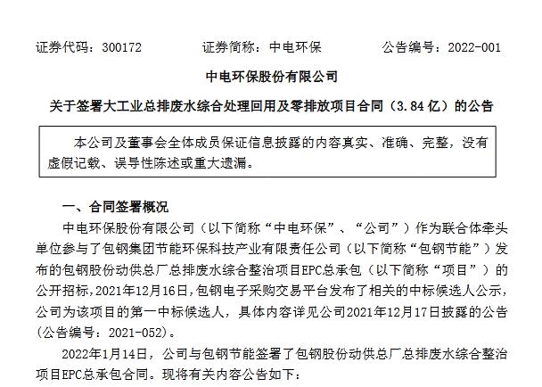 1月14日中電環(huán)保公布,公司作為聯(lián)合體牽頭單位參與了包鋼集團節(jié)能環(huán)保科技產(chǎn)業(yè)有限責(zé)任公司(“包鋼節(jié)能”)發(fā)布的包鋼股份動供總廠總排廢水綜合整治項目epc總承包的公開招標(biāo),2021年12月16日,包鋼電子采購交易平臺發(fā)布了相關(guān)的中標(biāo)候選人公示,公司為該項目的第一中標(biāo)候選人。