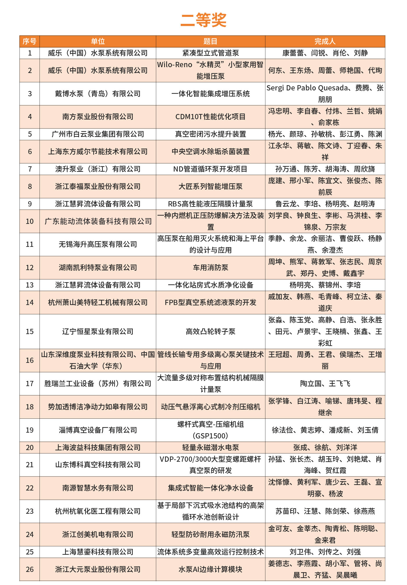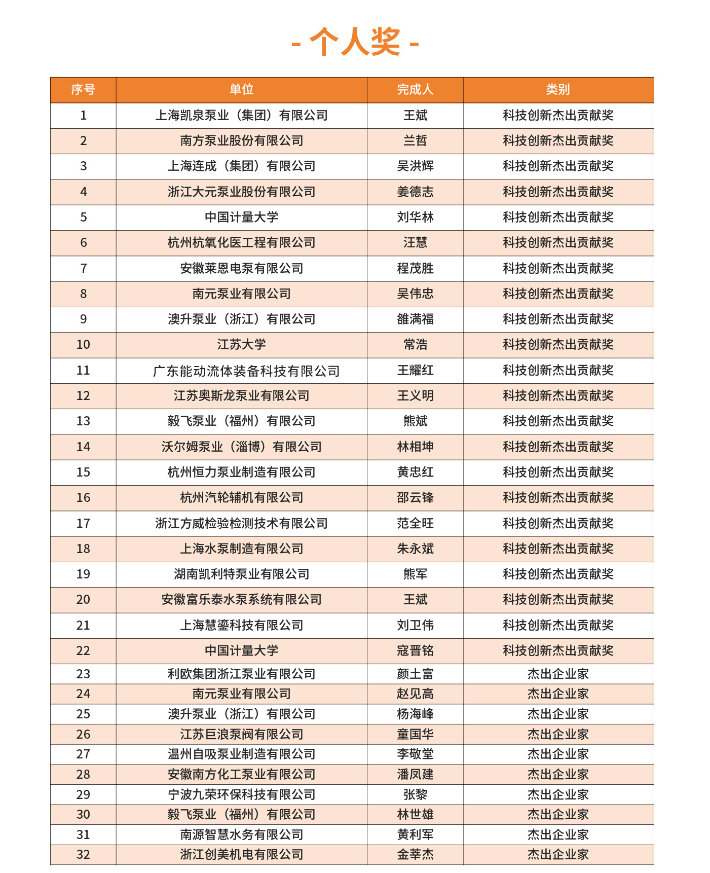 2025年第四屆FLOWTECH CHINA全國流體裝備技術創(chuàng)新獎經(jīng)過10位嘉賓的專業(yè)評審,共評選出了威樂、南方、利歐、新界、白云、沃爾姆、澳升等在內的一、二、三等獎,凱泉泵業(yè)王斌、南方泵業(yè)蘭哲、利歐集團顏土富等32位個人獎。
